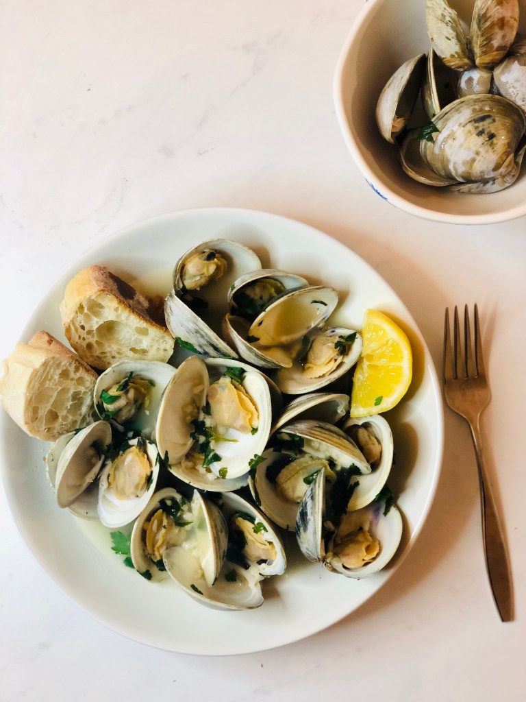 One of my favorite tapas dishes are yummy littleneck clams in a super garlicky white wine sauce. It’s a very simple, very savory dish that I can’t get enough of. If you are new to cooking clams, make sure that you let the clams soak in cold water for 10 minutes so that all of the sand and grit falls to the bottom. The clams also give off a salty natural juice, so I don’t find that I need to add any additional salt. I prefer this dish with a side of lots of crusty bread such as ciabatta or baguette, but it would also be amazing on a bed of linguini or spaghetti.