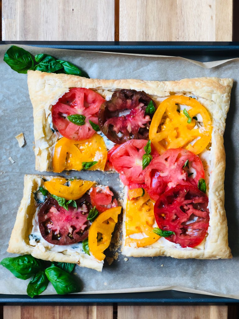 August is the peak of heirloom tomato season, and what better way to celebrate than with a beautiful tomato tart. This tart only has 5 ingredients, so it will only be as good as your tomatoes are. I had to hunt through a few supermarkets to find these, but it was worth it. You can use any soft cheese or spread as the base, but I chose to use goat cheese. Whipped feta, ricotta, or burrata would also be amazing. This recipe is definitely a show stopping summer treat!