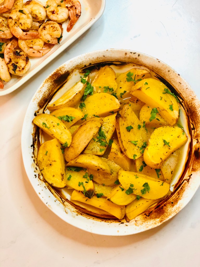 For me, Greek food is all about the appetizers and sides. This includes Greek salad, hummus & tzatziki, and these super lemony roasted potatoes. All you need with these potatoes are some grilled shrimp and rice or pita, and you’ve got a healthy Greek inspired dinner. It does take a while to slow roast the potatoes, but trust me, it’s pretty low maintenance and well worth your time.