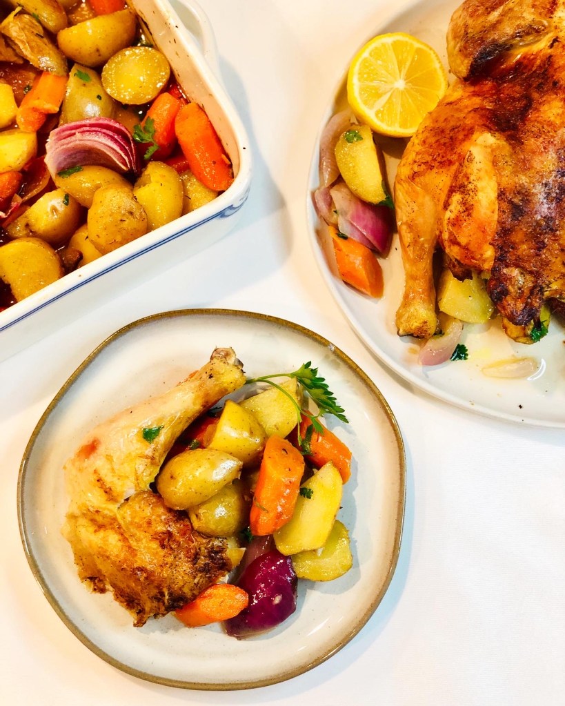 Growing up, I loved two things on the weekends- watching Ina Garten (aka Barefoot Contessa aka the Queen,) make her Friday night roast chicken dinner, and going to Boston Market to get my own roast chicken dinner. In my current state, I don’t have cable to watch The Food Network, and there is no Boston Market near me, so I’ve had to make my own. This roast chicken recipe is super classic, super simple, and super delicious. It of course takes some time for an entire little chicken to fully cook, but it’s very low maintenance and worth the wait!