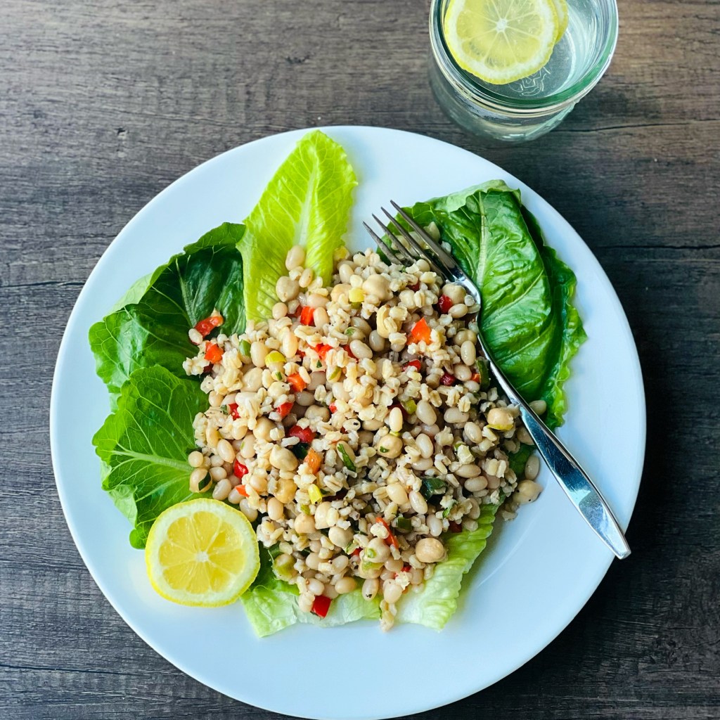 This recipe is a straight up copycat of an amazing bean and barley salad that I had from Costco over Memorial Day Weekend. I absolutely love barley and think it is such an underrated grain, and I never had navy beans prior to this salad. This vegan salad is super filling, colorful, and vinegary from the dressing. It’s the perfect picnic/BBQ side dish, or a nice weekday lunch. Unfortunately, navy beans do not come canned, so it takes about 50 minutes to cook on the stovetop, but you could also use canned white beans and quick cook barley for a shortcut.
