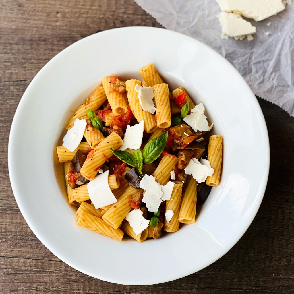 Pasta alla Norma is one of my favorite pasta dishes because it’s fresh, healthy, and filling. It is very simple to make, and only really requires 3 main ingredients- pasta, eggplant, and tomatoes. You can use any type of tomatoes- I have made this with plum and beefsteak tomatoes, but would definitely recommend fresh over canned for this recipe. If my tomatoes are not the sweetest, I like to add in just a pinch of sugar. I was fortunate enough to find ricotta salata (the traditional cheese for this dish) on Freshdirect, but Parmesan shavings would work beautifully too.