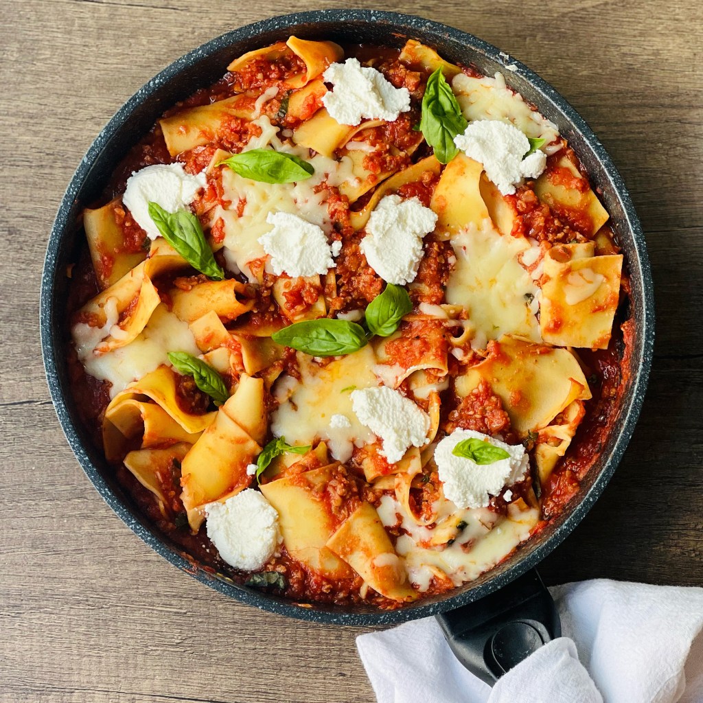 I love a thick and hearty lasagna, but it’s quite laborious to cook everything on the stovetop, layer the ingredients, and then bake it for an hour. This quick skillet lasagna delivers all of the flavors and elements of a traditional lasagna, but with less steps and time! I use lasagna noodles that I break into thirds, but any pasta shape would work. I personally use reduced fat mozzarella and ricotta because I think it tastes exactly the same, (but makes me feel much better!)