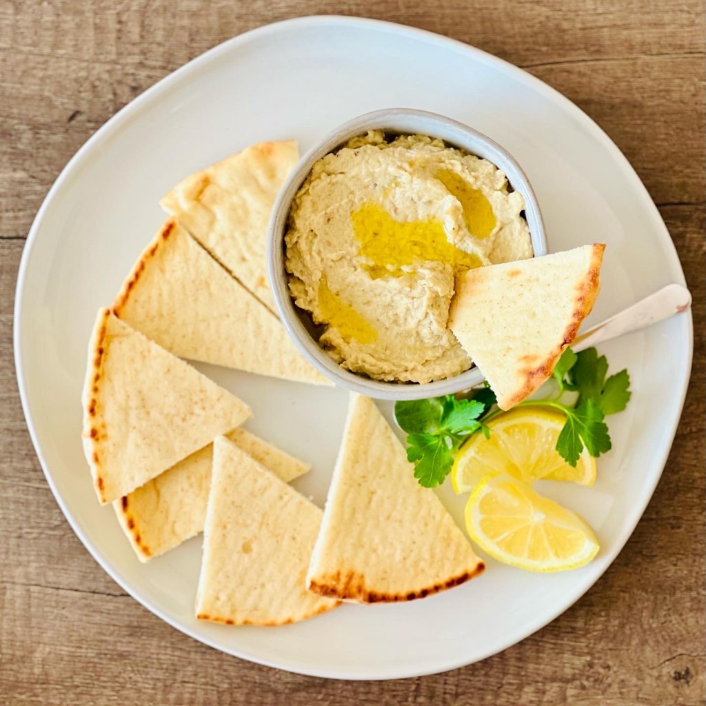 4. Add the eggplant, tahini, garlic, lemon juice, and olive oil to a food processor, and blend until smooth. Season with salt and pepper, and serve with pita bread.