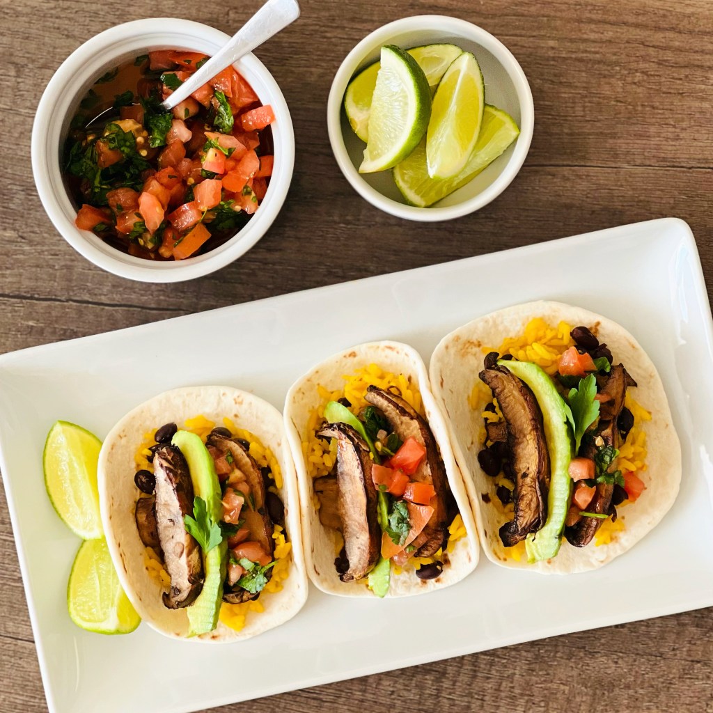 4. Assemble the tacos with the mushrooms, rice and beans, sliced avocado, and pico de gallo.