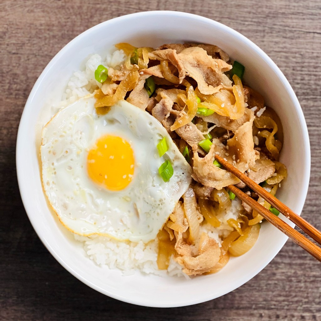 3. Serve the pork over rice, and top with a fried egg, scallions, and sesame seeds.
