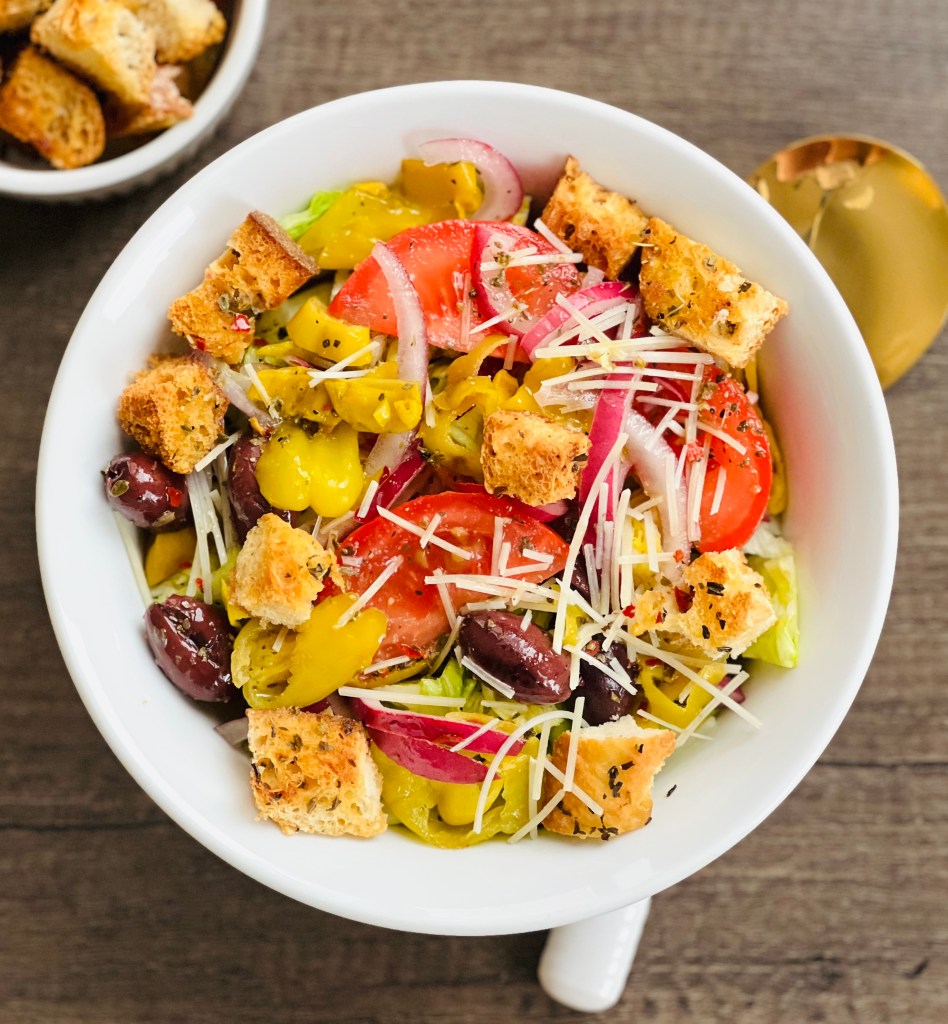 Say what you want about Olive Garden food, but their salad is undeniably addictive. It’s not the fanciest salad around town, and yes- I know it’s made with iceberg lettuce, but it’s just too good to ignore. This Italian dressing is super simple, flavorful, and a lighter dressing option. I love the combination of the crunchy red onions, sour pepperoncini, sharp parmesan cheese, and of course the golden brown croutons. I could easily eat a huge bowl of this salad for a quick weekday lunch.