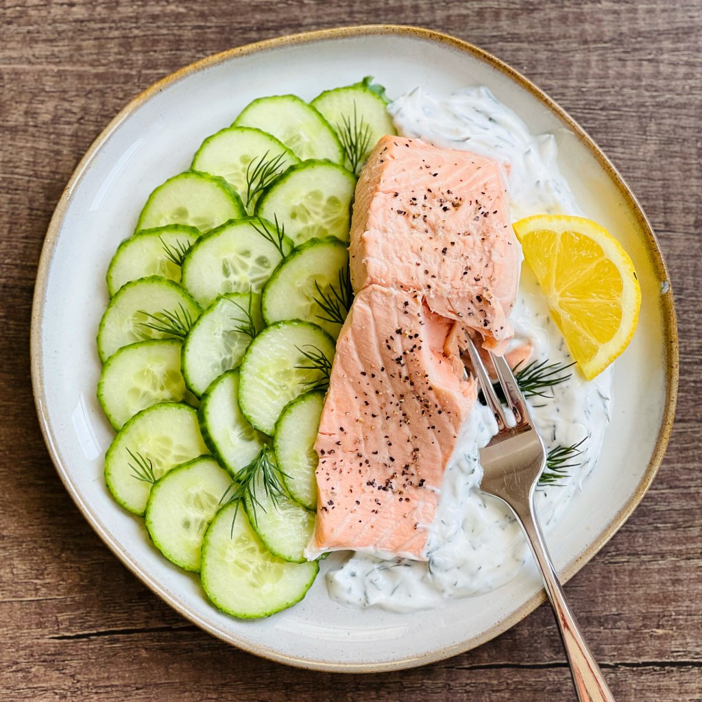Poaching anything always sounds so fancy and complicated, but poached salmon is probably the easiest way to cook salmon! Not only is it super fast and healthy, but if you live in an apartment, you can avoid having your entire place smell like salmon for days. My favorite way to eat poached salmon is at room temperature with a salad and lots of dill yogurt sauce on the side. This is a great recipe for an easy weekday lunch.