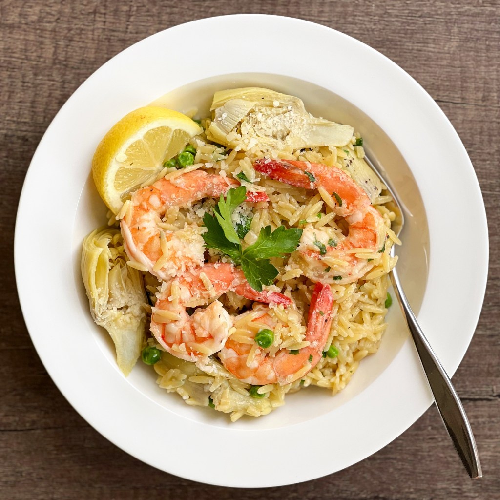Spring is in the air, and with that comes plenty of new spring recipes such as this delicious shrimp orzo. It’s a super simple one pot recipe that requires just a few ingredients, and is pretty light and healthy. I love orzo, and wanted to incorporate some of my favorite spring vegetables- peas and artichokes. If you’re not a fan of those, asparagus and zucchini would also be great in this dish. All this orzo needs is a hefty squeeze of lemon juice, a boat load of garlic, and a light dusting of parmesan.