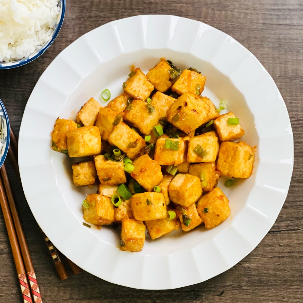 5. Reduce the heat to low, and add the sauce to the skillet and let thicken for a few minutes. Toss in the scallions, and serve the tofu over jasmine rice.