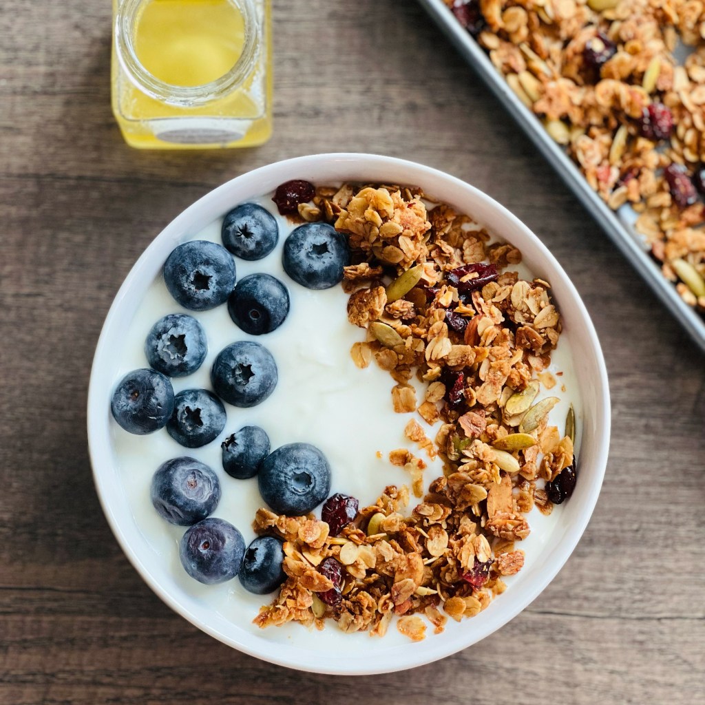I have tried dozens of granola brands over the years, but I recently realized that I still haven’t found the perfect one! So I decided to make my own version at home, exactly how I like it. My favorite granola add ins are pumpkin seeds, almonds, and dried cranberries, but I will definitely switch it up and sometimes use chocolate chips, shredded coconut, chopped hazelnuts, etc. I always eat my granola in yogurt parfaits with honey drizzled on top, so I don’t make mine too sweet. Making granola was a lot easier than I had anticipated, and it makes your entire house smell delightful.