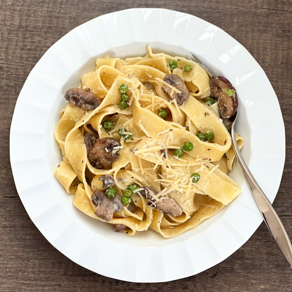I had a huge craving for pappardelle pasta this week, and decided to make this delicious creamy mushroom pasta. Pappardelle is a thick, chewy pasta that goes perfectly with a mushroom rosemary cream sauce. This recipe is vegetarian friendly and just a little decadent from the heavy cream and parmesan. It’s basically a very light version of a mushroom Alfredo sauce, and so satisfying.