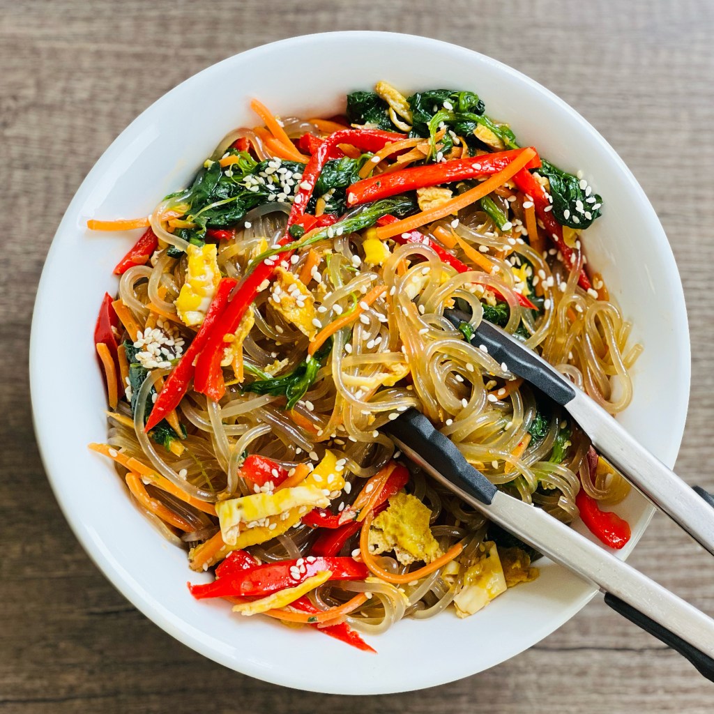 Japchae is one of my favorite Korean dishes, and a super healthy and flavorful recipe to make ahead for meal preps. Japchae noodles are made out of sweet potatoes, and are often called “sweet potato glass noodles” or “japchae noodles.” I love the bouncy, chewy texture of these noodles, and you can customize this recipe with any vegetables and protein (I kept mine vegetarian.) Japchae is great for meal prepping because this dish can be eaten at room temperature or chilled. It takes a bit of chopping and prep work, but it’s worth the 30 minutes!