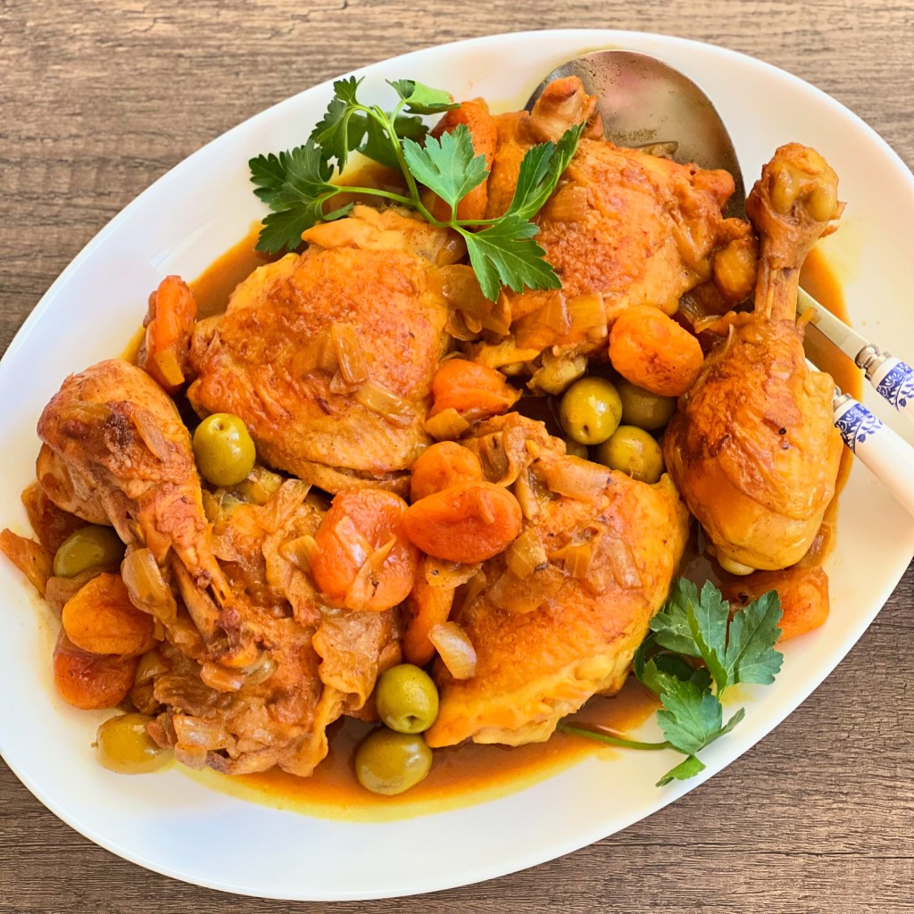 Chicken tagine is probably my favorite Middle Eastern/Moroccan dish. There are so many amazing spices and flavors in tagine that make it memorable. I have seen many variations at restaurants and in recipes online- some incorporate tomatoes, preserved lemons, chickpeas, cilantro, etc. I tried to keep this recipe as simple as possible without losing the essence of the dish. I also chose ingredients based on my favorite components of the variations that I have had- apricots and green olives. I recommend serving this with couscous or any type of rice. I’m not sure how authentic the end result is, but it still cures my cravings for chicken tagine.