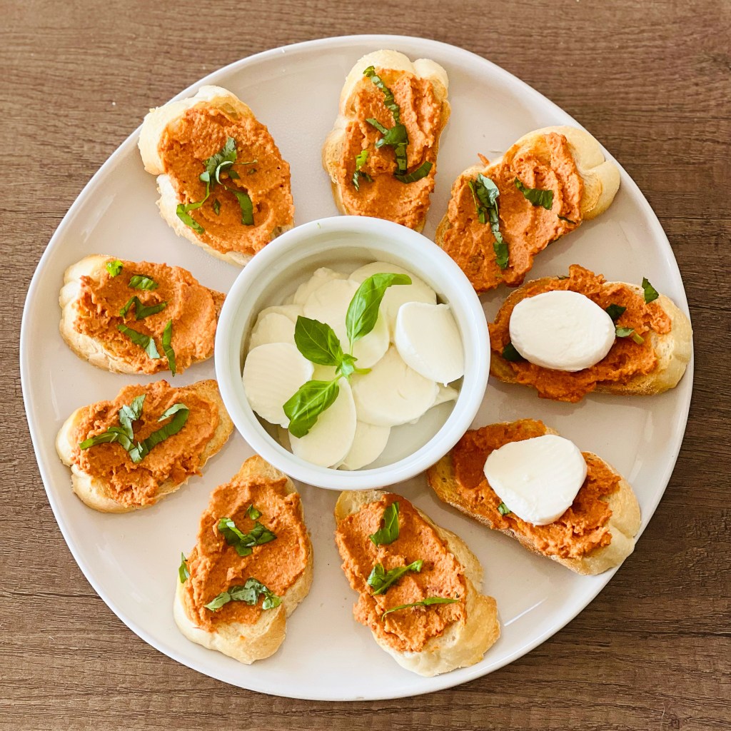 Sun dried tomato pesto is an easy and fun twist on classic basil pesto. I love the sweetness and concentrated tomato flavor from the sun dried tomatoes, and this pesto is the perfect spread for many dishes. My favorite way to eat this pesto is on toasted crostini with fresh mozzarella and basil. It would also be delicious on baked salmon or with spaghetti as a pasta sauce- the options are endless! If you want to make this pesto lighter, you can also reduce the amount of olive oil and substitute with the water that the tomatoes are rehydrated in.