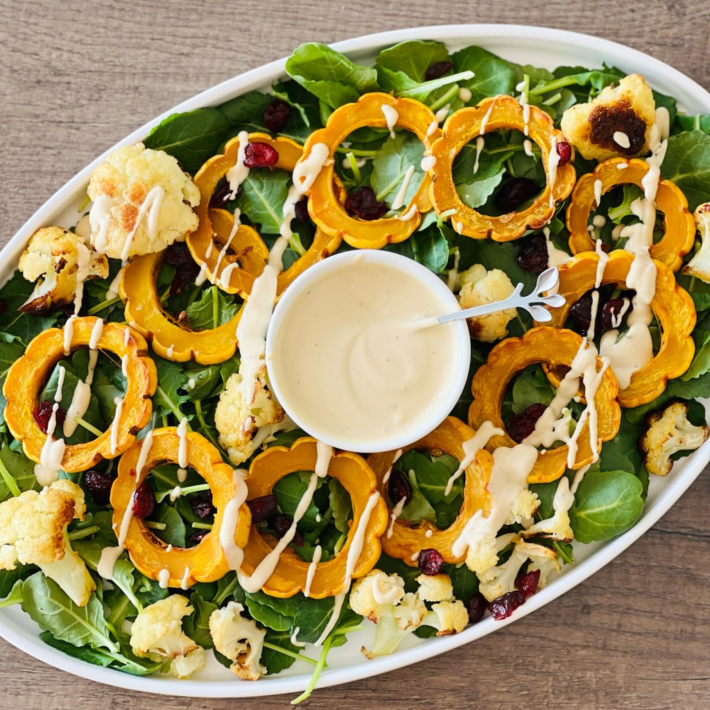 If you’re looking for a new, fun salad dressing, this tahini dressing is the answer to your prayers. It’s super creamy from the tahini paste, and little tangy from the apple cider and red wine vinegars. It is the perfect pairing for roasted vegetables on top of a salad. In the fall and winter, I love eating this tahini dressing with roasted delicata squash and cauliflower, but I have also used roasted carrots, brussel sprouts, and beets. If you want to make this a lighter dressing, you can substitute 2 tbls of the olive oil for water.