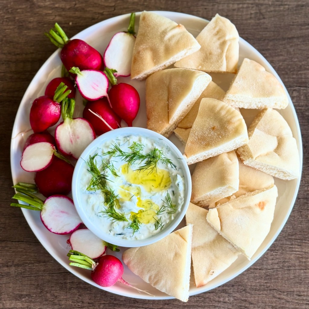 Greek food is one of my favorite types of cuisine, and the dips are part of what makes it so delicious. There are a number of amazing Greek dips, but tzatziki is definitely towards the top of the list for me. Tzatziki is actually super simple to make- the hardest part is grating the cucumber and squeezing out all of the liquid. Other than prepping the cucumber, it’s just a matter of stirring to bring together the dip. I chose to use 2% Greek yogurt, but you can use any type of plain Greek yogurt. And of course, you have to have some fluffy pita bread and crunchy vegetables to serve this with.