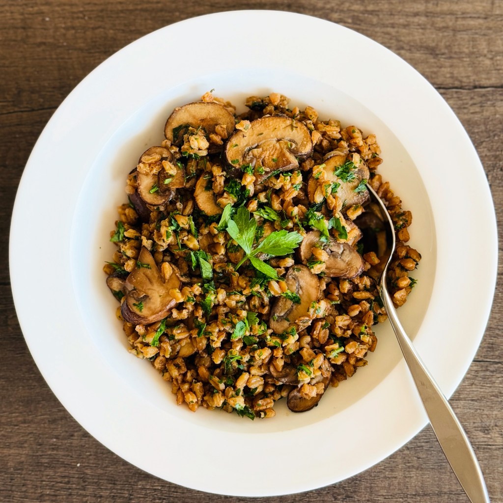 5. Once the farro is cooked, add the mushrooms back into the pot, stir in the parsley, and serve.